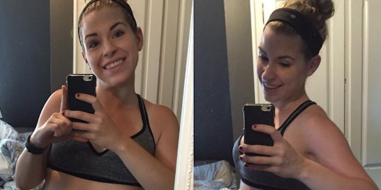 In the before-and-after photo below, you can't see her stretch marks at all. Angles can be deceiving, but Rachel doesn't want to fool her followers into thinking everything is perfect after losing weight.
