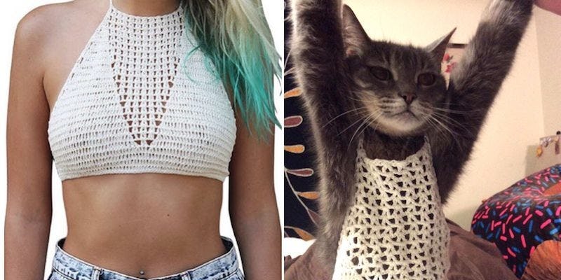 To show the world how ridiculously small this top really is, a parent dressed an adorable cat up in this itty-bitty top, and I have to tell you, it fits this little feline fabulously.