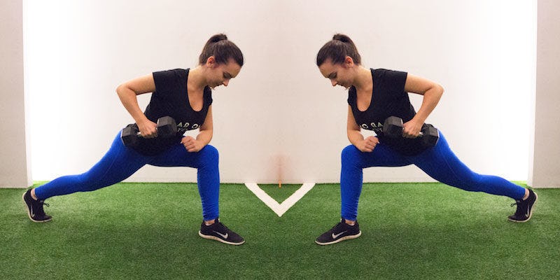 Lunge forward with your left arm grasping the dumbbell. Bend your arm on the knee that's at a right angle. With your weight, concentrate on pushing the elbow back while bringing the weight to your chest.