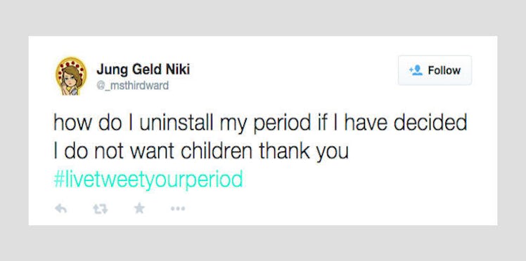 how do I uninstall my period if I have decided I do not want children thank you #livetweetyourperiod — Jung Geld Niki (@_msthirdward) June 18, 2015